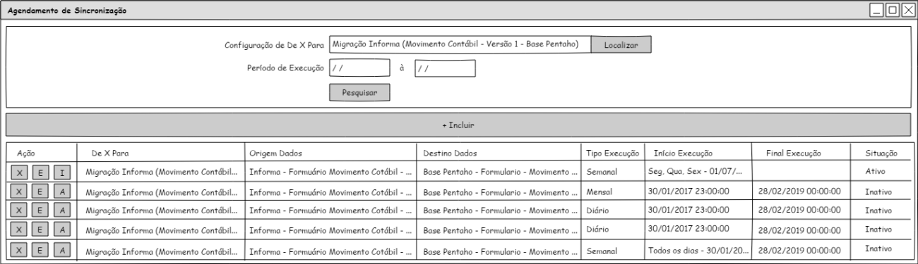 Através da consulta dos agendamentos de sincronização por De X Para, o usuário poderá excluir uma sincronização através do botão “X”, editar uma configuração de agendamento de sincronização através do botão “E”, inativar uma configuração a partir do botão “I” ou ativar uma configuração que esteja inativa a través do botão “A”.