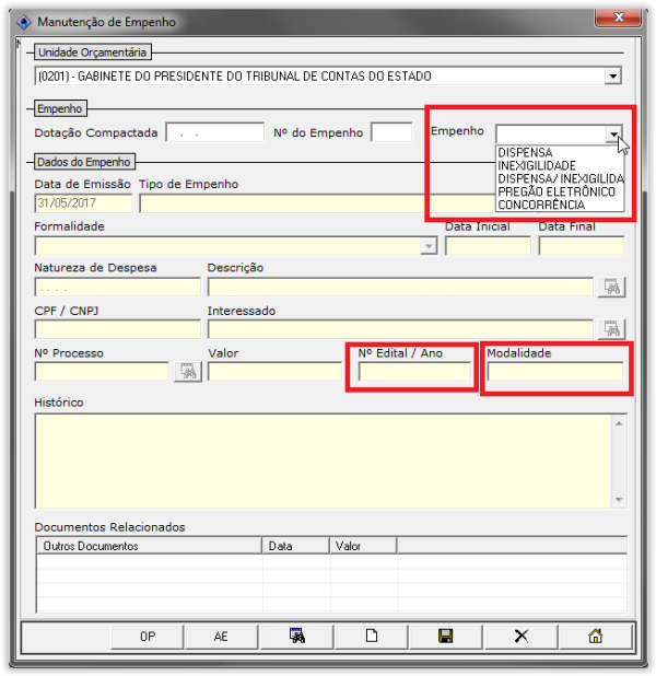 Adequar rotina de manutenção e controle de Empenho, acrescentando os campos 'Nº. Edital/ Ano, 'Modalidade' (dispensa/ inexigilidade, pregão eletrônico, concorrência, etc), 'Tipo do Empenho' (bem fornecido ou serviço prestado).