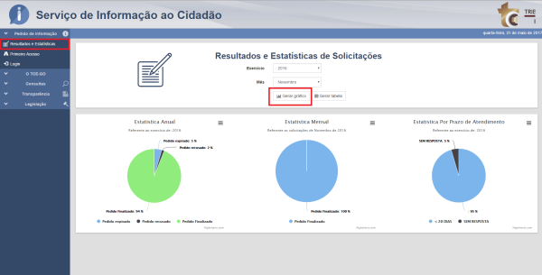 No e-Sic, será incluso uma tela para apresentar os dados estatísticos, em formato de gráfico, referente às solicitações de informação. Deverá apresentar dados estatísticos refentes ao status das solicitações por períodos anuais e mensais, como também dados referentes ao prazo de atendimento das solicitações. Os gráficos apresentados em formato de pizza, serão gerados utilizando a api HighCharts (api já utilizada em outros relatórios e em outros sistemas do TCE-GO).