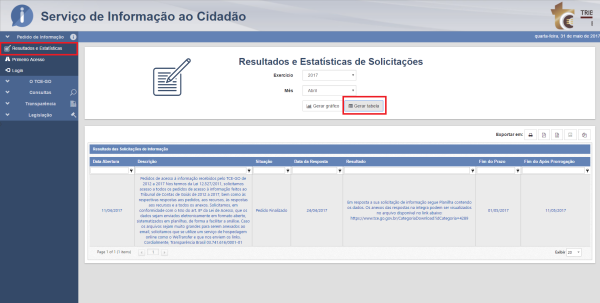 No e-Sic, será incluso uma tela para apresentar os dados dos resultados referente às solicitações de informação. Deverá apresentar a possibilidade de filtragem mensal e anual das informações geradas em tabela