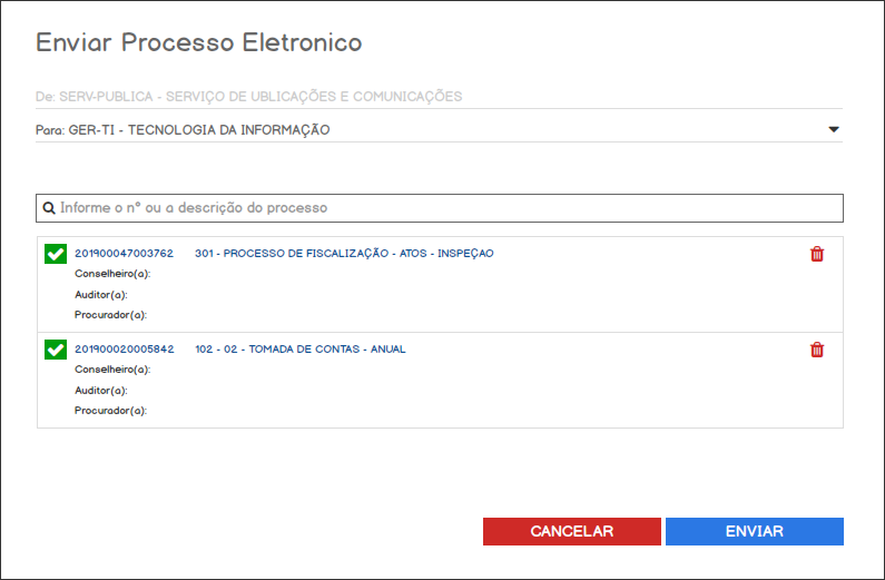 Proposta de solução para 5.2-EU9: Disponibilizar um recurso que possibilite enviar um ou mais Processos Eletrônicos, assim como previsto no protótipo aprovado pelo cliente. Verificar a possibilidade de reaproveitar o recurso de Envio existente para documentos criados pelo TCE-DOCS.