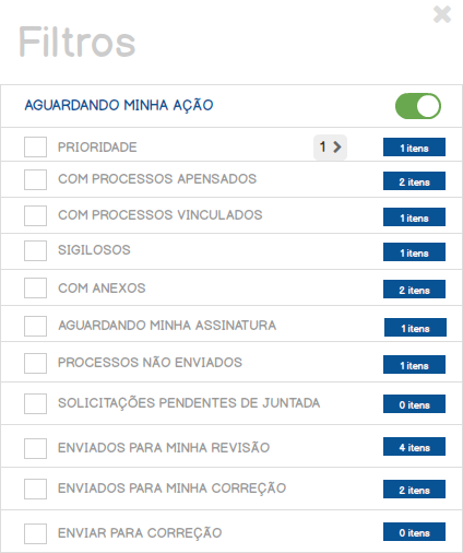 - Ao desabilitar a opção Processos aguardando minha ação, o filtro será aplicado a todos os processos que estão aguardando pelo menos uma ação de alguém do meu setor. Este retorno será exibido na aba Processos do setor;