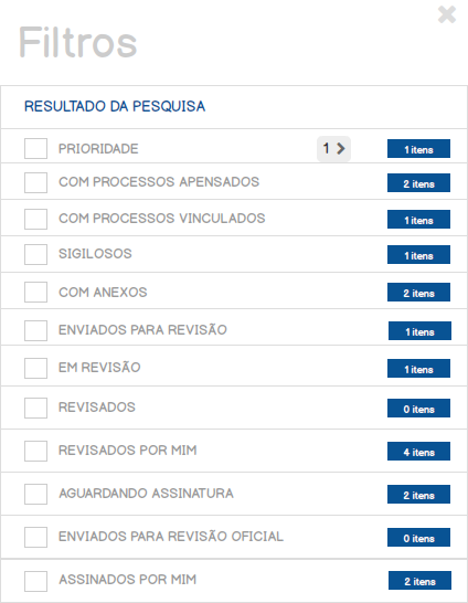 - Ao desabilitar a opção Meus processos, o filtro será aplicado a todos os processos do meu setor, ou seja, o retorno dos filtros selecionados serão exibidos na aba Processos do meu setor;