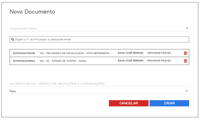 Se a opção escolhida for Comunicado interno, o sistema deve criar o documento para os processos selecionados e permitir inserir/remover um ou mais processos e um setor de destino, conforme tela abaixo: