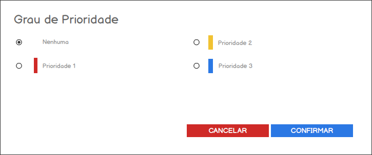 Através da ação Definir Grau de Prioridade (1º opção na Img_Acoes_Flutuante), será possível definir a prioridade de 1 a 3 para cada um dos processos. A definição pode ser realizada individualmente ou coletivamente quando mais de um processo for selecionado. O Padrão será igual a Nenhuma.