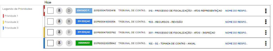 Proposta de solução para 5.2-EU11: Adicionar um marcador de prioridade a frente do colapso de cada processo, respeitando as cores definidas para as prioridades 1 (vermelho), prioridade 2 (Amarelo) e prioridade 3 (azul), conforme imagem a seguir: