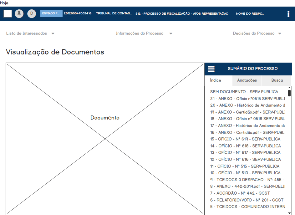 Deve ser possível visualizar o sumário do processo, onde deverão ser exibidos os documentos processuais, lista de interessados, Informações do Processo (histórico do processo, Relator, Auditor e Procurador) e Julgamento (decisões do processo).