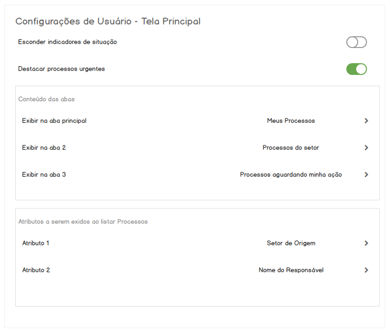 Adicionar à configuração, as parametrizações: Esconder indicadores de situação para que ao listar processos não sejam exibidas as etiquetas com a situação do processo e Destacar processos urgentes, para que sejam destacados na cor vermelha.