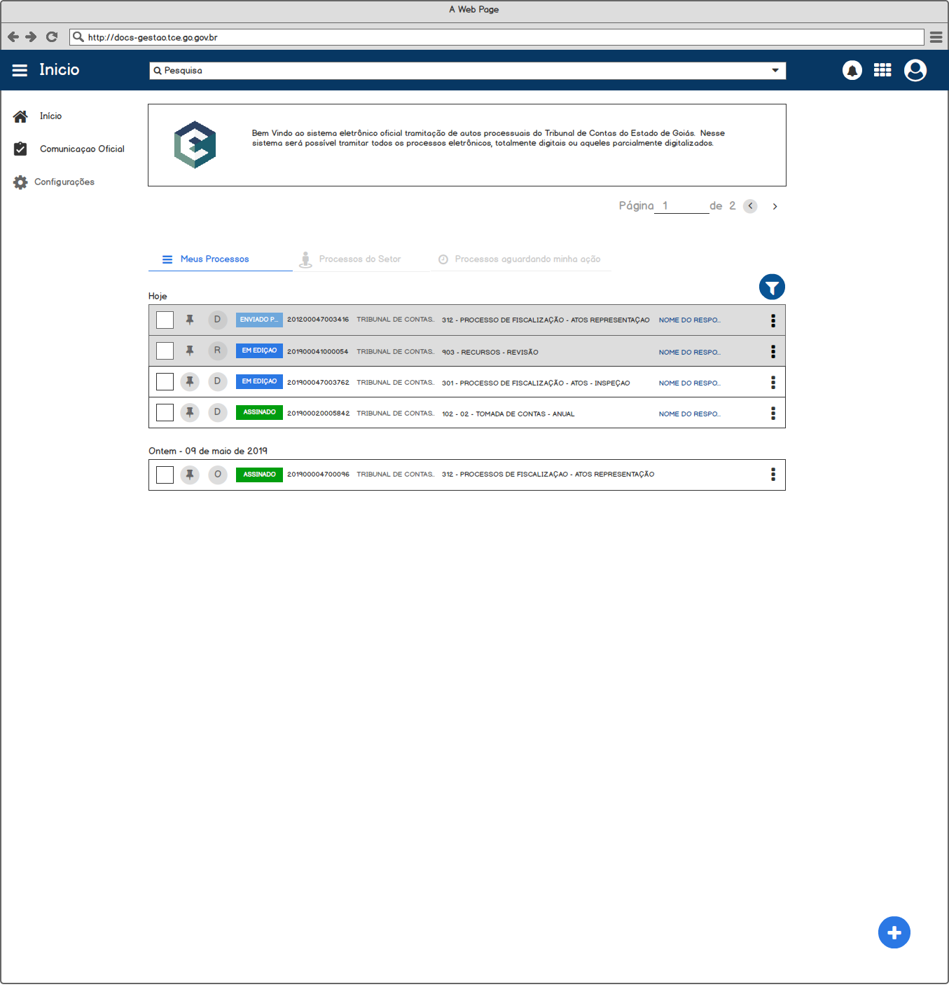 O sistema deve possuir interface agradável, usabilidade intuitiva e permitir que com poucas ações o usuário consiga visualizar processos, seus documentos, suas informações, criar documentos e realizar as ações permitidas nos processos que estão com andamento atual no meu setor. Este sistema deve seguir o mesmo modelo visual e comportamental definido para plataforma TCE-DOCS. Ao logar no sistema, o usuário deve ter a liberdade de selecionar um dos seus setores de atuação, para consultar e gerir processos, documentos, anexos e demais informações que sejam vinculadas a processos. A tela inicial do sistema será exibida agrupando os processos em três abas, conforme configurado pelo usuário logado. Os processos, serão exibidos colapsados e serão expandidos sob demanda, assim como, os processos apensados e vinculados, bem semelhante ao comportamento das Remessas no TCE-DOCS. Quando um ou mais processos forem selecionados o sistema deve permitir acionar ações que possam ser executadas individualmente ou coletivamente, conforme a regra exigida pelo negócio. A solução deve contemplar o mesmo comportamento já existente para a busca de processos e busca textual, ou seja, uma varredura em todos os processos ou documentos processuais. Adicionar na solução, à busca de processos por descrição, de tal forma que a aplicação tenha a inteligência de reconhecer se a busca deve ser realizada pelo nº ou pela descrição do processo e uma nova aba para exibição do resultado das pesquisas e das buscas textuais. O sistema deve disponibilizar um recurso que possibilite a visualização de processos principais, apensados ou vinculados e os andamentos, em uma nova aba do navegador, conforme a necessidade do usuário. Esta solução deve contemplar os comportamentos, telas e demais informações contidas no Wireframe definido e aprovados pelo cliente para implementação deste sistema.