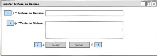 - [Img1 - 1] Ao clicar no botão incluir o sistema fará uma transição escondendo a seção da [Img1] e mostrando os campos a serem preenchidos para que a inclusão da síntese da decisão possa ser efetuada ([Img2]);
