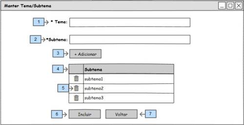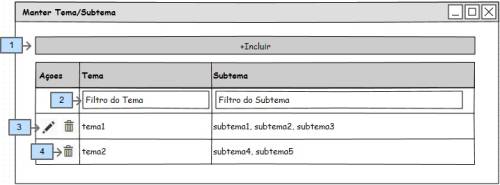 - [Img1 - 3] O botão alterar deve efetuar um comportamento semelhante ao incluir (descrito logo a cima), porém ele deverá preencher os campos ([Img2 - 1 até 2]) com os dados do tema e subtemas da linha selecionada e altera o texto do botão Img2 - 3 de “Incluir” para “Alterar”;