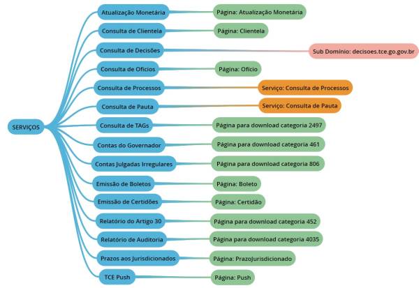 As imagens acima mostram o mapa do site até o acesso a páginas e serviços de primeiro nível. Para visualizar mais detalhes dos itens de menu e o mapeamento dos portais vinculados ao site, veja o arquivo completo em: Mapa do site - Mind Map Model (https://www.goconqr.com/pt-BR/p/9318381-Levantamento-de-p-ginas-e-fun--es---Site-TCE-GO-mind_maps).