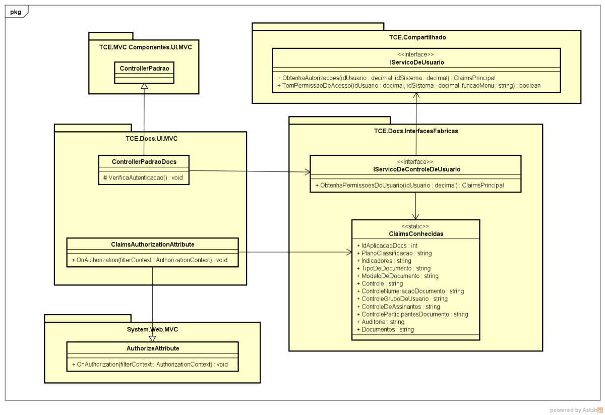 No controlador de cada funcionalidade será registrado por anotação, utilizando a classe útil TCE.Docs.UI.MVC.Utilitarios.ClaimsAuthorizationAttribute, a ou as permissões de acesso que usuário deverá ter para acessar a funcionalidade (controlador), utilizando as funções acessadas pela classe TCE.Docs.Enumeradores.Seguranca.ClaimsConhecidas.