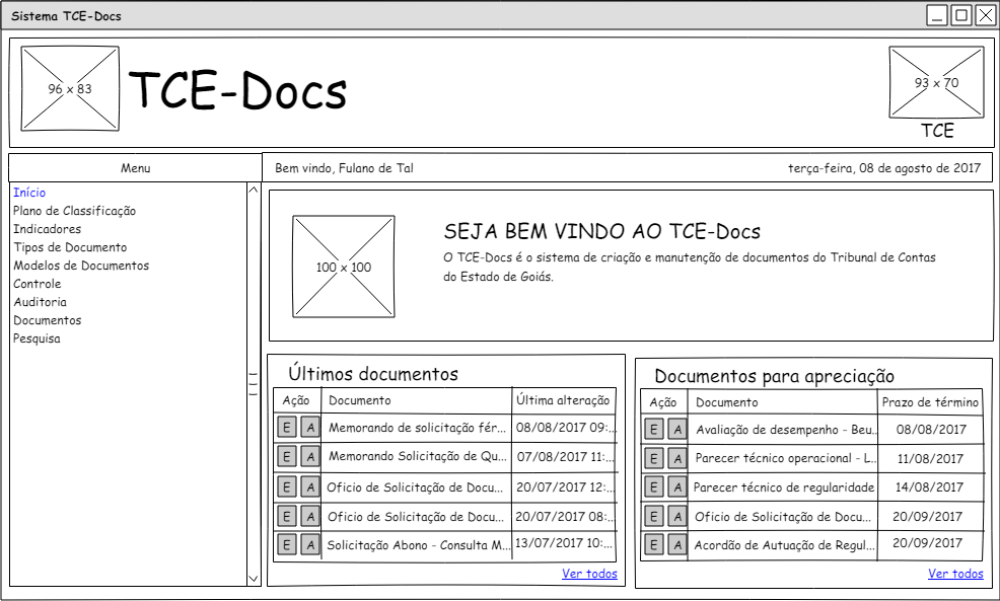 O menu Início será padrão para qualquer acesso ao sistema que apresentará comportamento diferente quando o usuário estiver logado no sistema. Ao acessar o sistema esse menu será acessado automaticamente, carregando na tela a apresentação do sistema com uma breve descrição do propósito do sistema TCE-Docs. Caso o usuário esteja logado, serão apresentados 5 (cinco) últimos documentos criados, ou editados, ou publicados (assinados) pelo usuário - funcionalidade Últimos documentos, bem como os documentos remetidos ao usuário para apreciação - funcionalidade Documentos para apreciação.