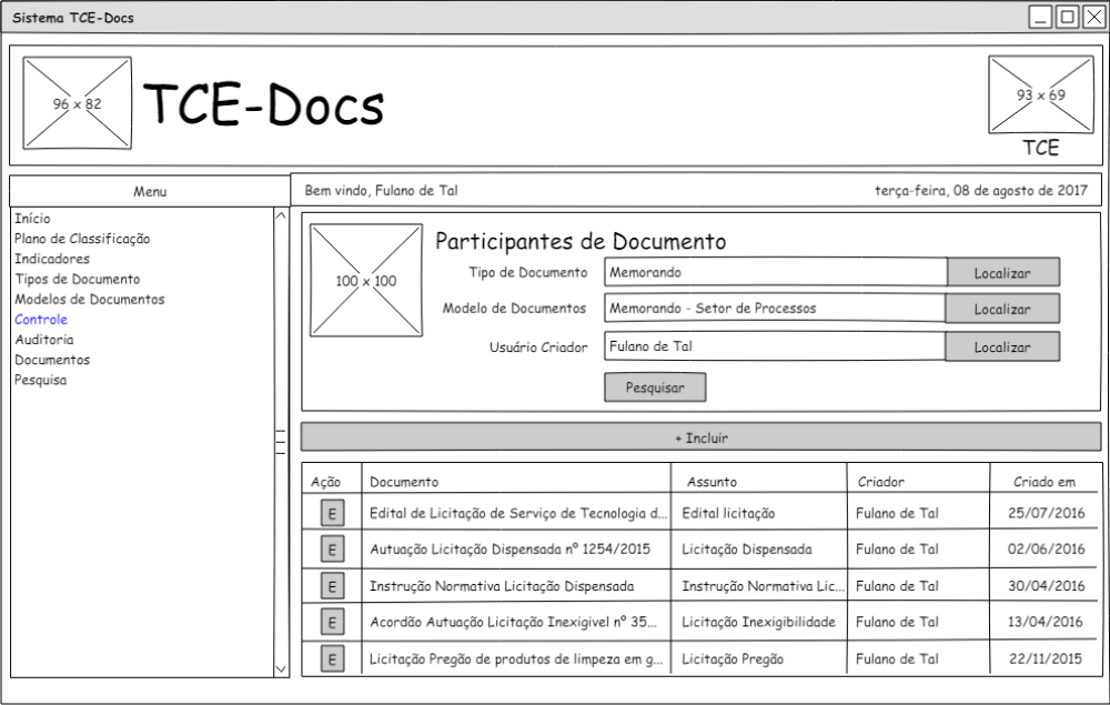 Os documentos criados e mantidos pelo sistema TCE-Docs poderão ser acessados e mantidos por pessoas diferentes de quem criou o documento, para isso é necessário que na funcionalidade de manutenção de documentos permita que seja incluído participantes no documento. Essa funcionalidade de Controle de Participantes no Documento permitirá que se possa incluir usuário ou grupos de usuário ao documento, permitindo que esses usuários possam participar do documento de forma a editar o documento ou assinar o documento.