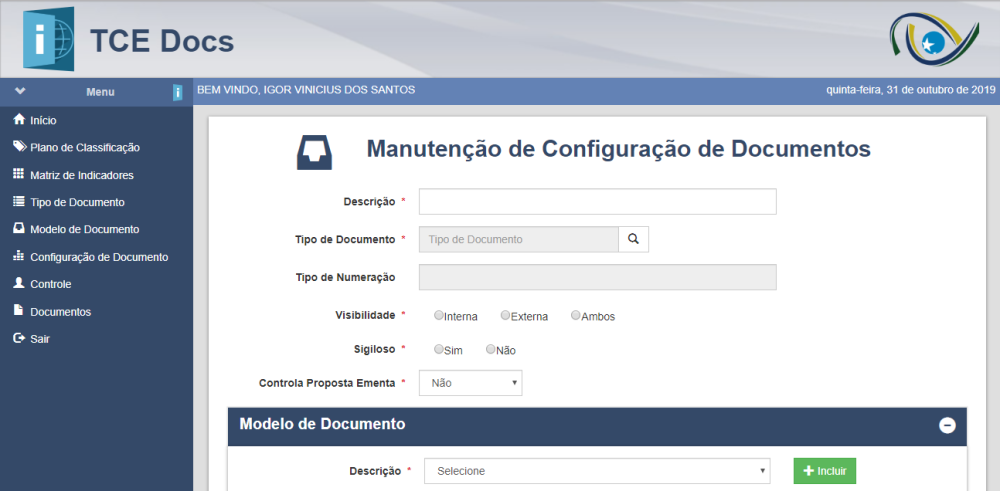 - Caso a propriedade Controla Proposta Ementa seja “Sim”, o sistema deverá exigir que todos os modelos de documento tenha em sua configuração indicador de modelo com a chave de integração no indicador personalizado KEY_EMENTA.