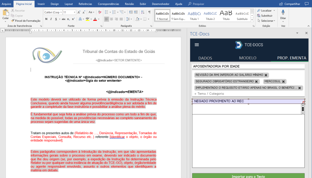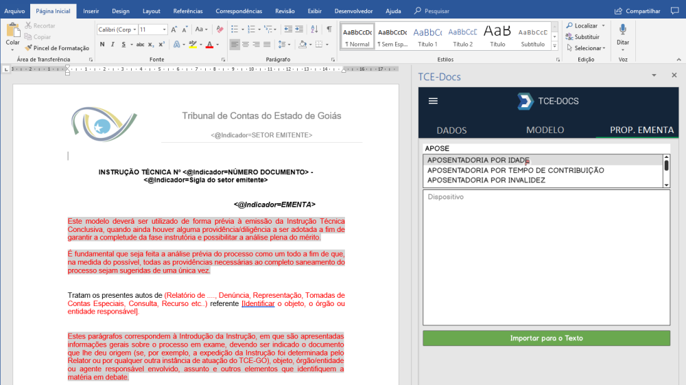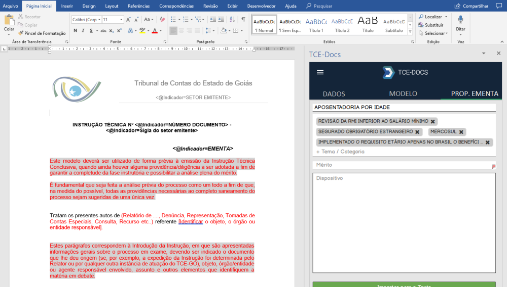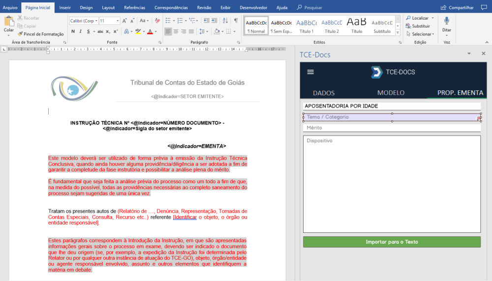 Na produção de documento para documentos cuja configuração de documento esteja configurada para controlar proposta de ementa, a solução add-ins do TCE.Docs irá apresentar uma nova aba chamada “PROP. EMENTA” (Proposta de Ementa). Nessa aba o usuário irá configurar para montar a ementa do documento.