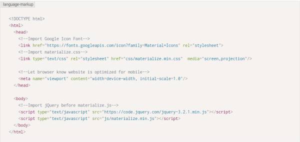 Em seguida, você deve se certificar que os arquivos estão sendo referenciados corretamente na sua página web. Geralmente é sábio importar os arquivos JavaScript no final do corpo do arquivo para reduzir o tempo de carregamento da página. Segue o exemplo abaixo de como importar o Materialize na sua página web.